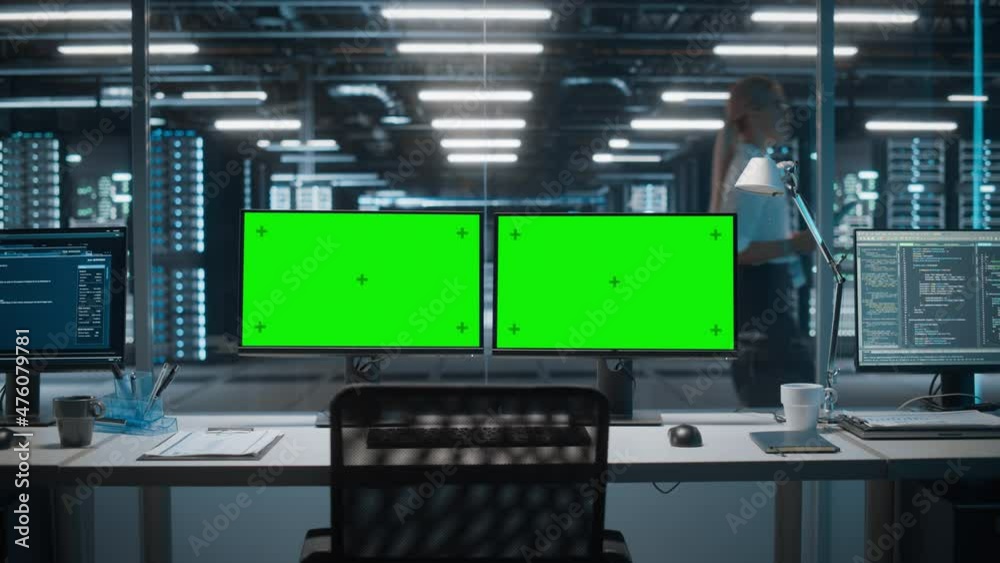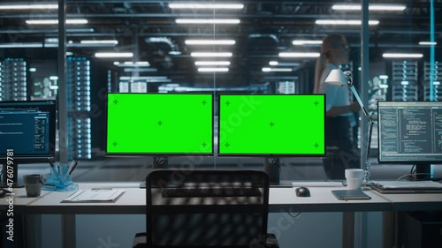 The watermark will not be included on Wall mural.: High-tech data center server with two green screen chroma key display showing on personal computer s