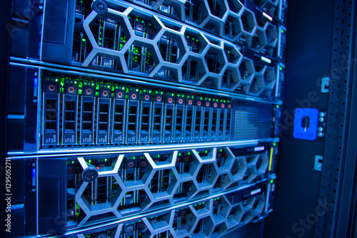The watermark will not be included on Wall mural.: High-tech data center with network servers and glowing lights