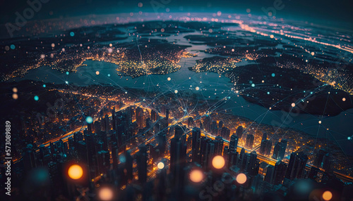 Wall mural : High tech data network color grids over miniature cityscape with cinematic coloring created with gen