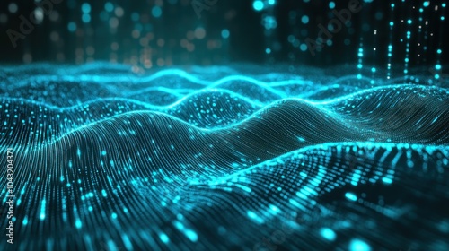 Wall mural high-tech digital wave grid in glowing cyan, pulsating over a dark gradient background