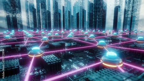 Wall mural high-tech energy grid with glowing nodes connected by neon lines. the grid is set against a futurist