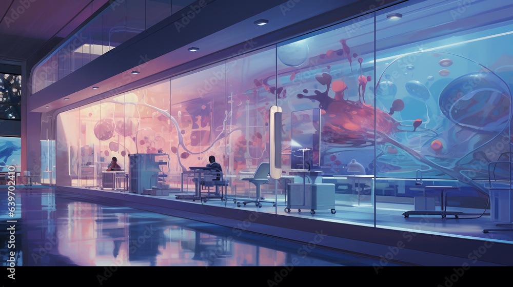 High - tech laboratory, sleek and clean, abstract representation of cellular structures projected onWall mural