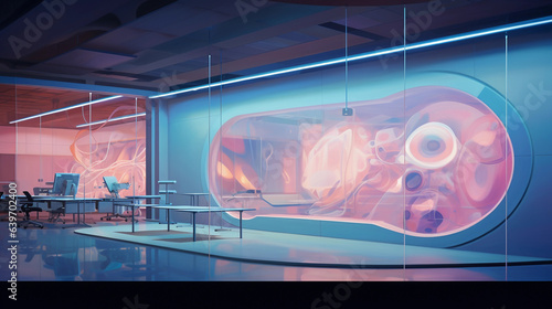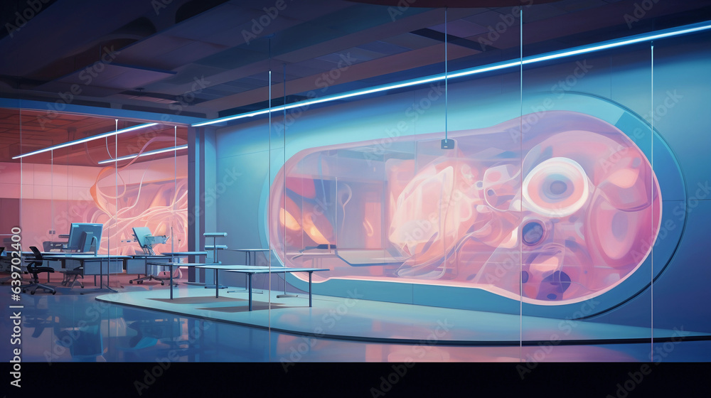 Wall mural : High - tech laboratory, sleek and clean, abstract representation of cellular structures projected on