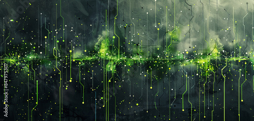 Wall mural hightech watercolor background with intersecting thin green lines and circuitlike patterns on a dark