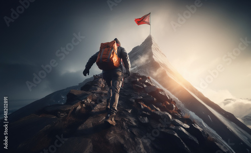 The watermark will not be included on Wall mural.: Hiker man heading to mountain top where there is a flag on top