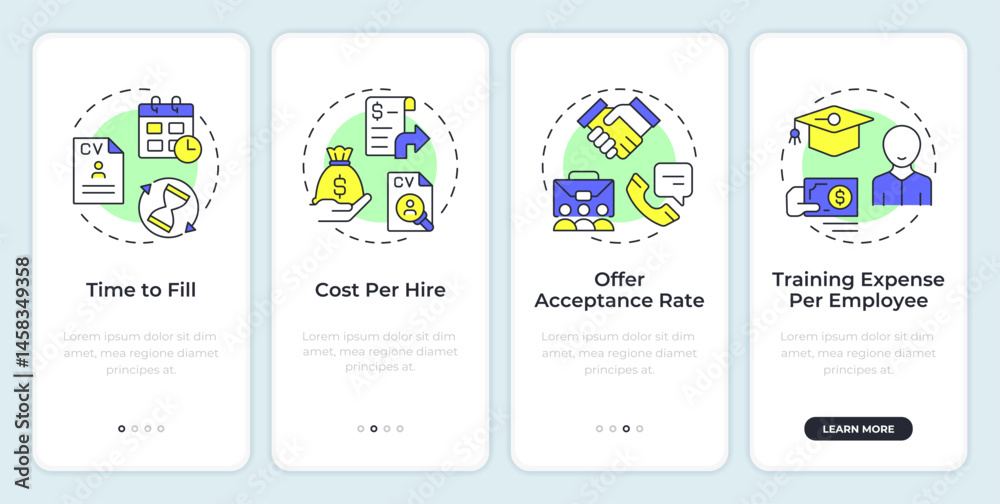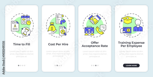 Hiring metrics onboarding mobile app screen - employment analytics - walkthrough 4 steps editable grapWall mural