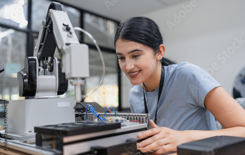 Wall mural : Hispanic engineer woman working on ai technology in robotics electronics engineering laboratory - uni