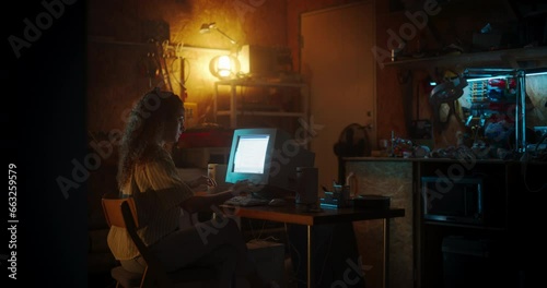 Wall mural : Hispanic female web designer using old desktop computer in retro garage late at night - focused inter