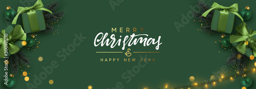 The watermark will not be included on Wall mural.: Holiday banner merry christmas and happy new year - xmas design with realistic objects, realistic dar