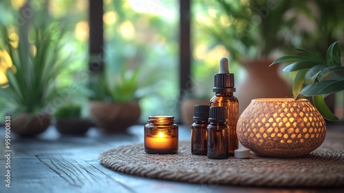 The watermark will not be included on Wall mural.: Holistic health practices a serene setup featuring natural remedies essential oils and meditation to