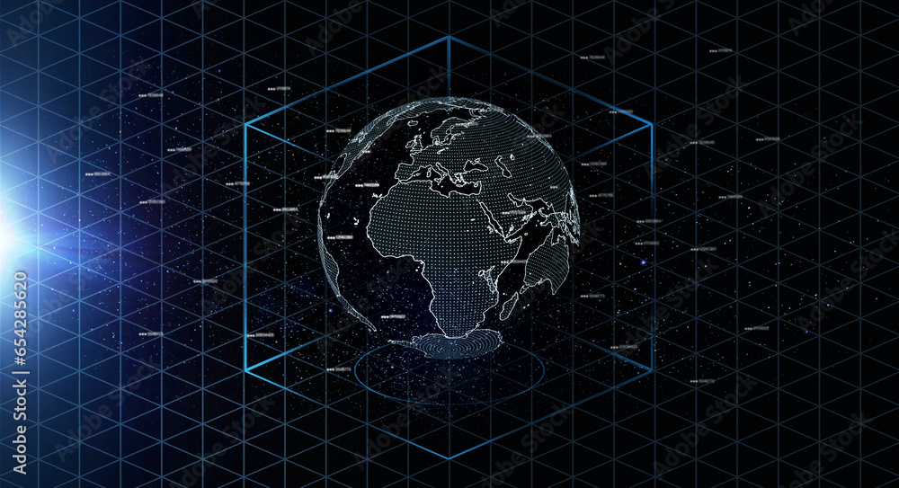 Wall mural hologram earth, planet and coding in space for global network, cube and cybersecurity and lens flare - Wall murals Wall mural hologram earth, planet and coding in space for global network, cube and cybersecurity and lens flare - Wall murals