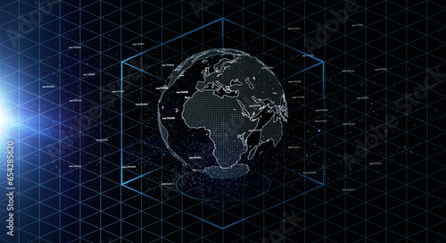 Wall mural : Hologram earth, planet and coding in space for global network, cube and cybersecurity and lens flare