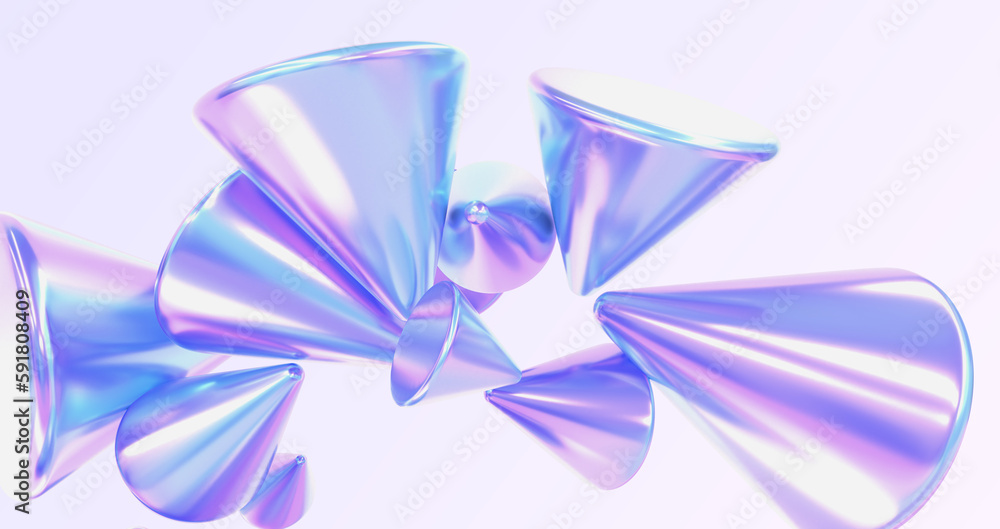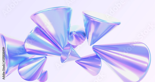 Wall mural holographic cones on abstract background 3d render. iridescent neon foil hologram shapes with glossy