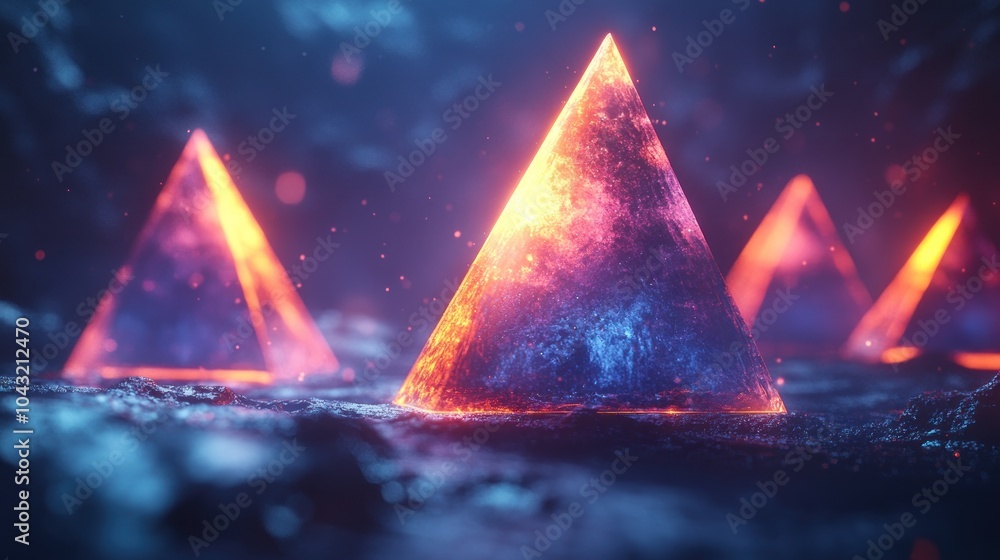 The watermark will not be included on Wall mural.: Holographic geometric shapes floating in a black void with subtle reflections and glowing edges