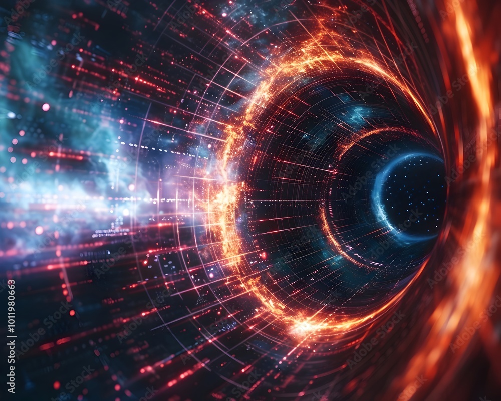 Wall mural holographic interstellar communication concept with glowing data streams through wormhole