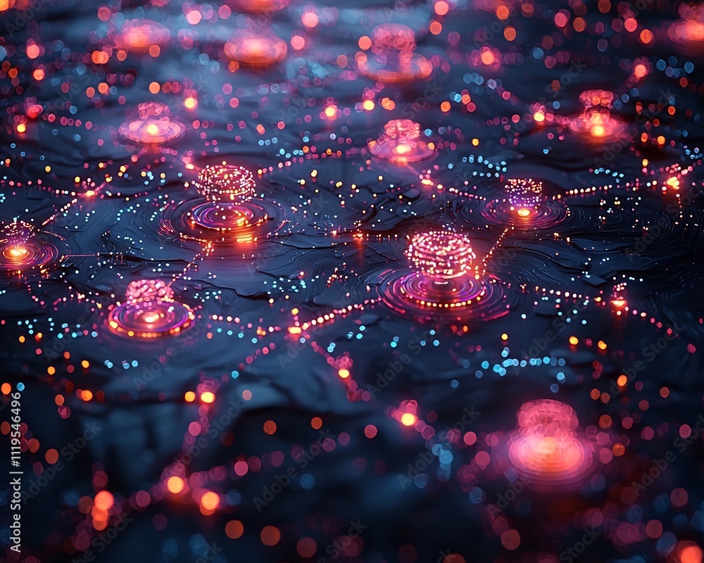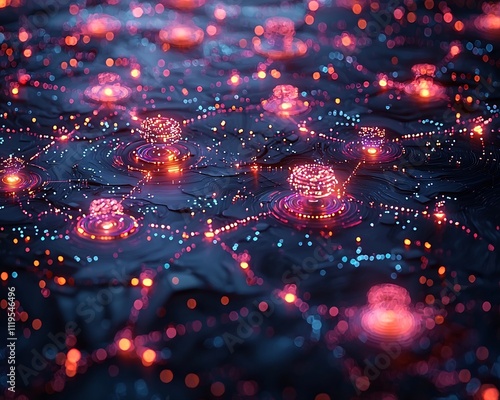 The watermark will not be included on Wall mural.: Holographic quantum internet nodes connected in real time with glowing data transfer