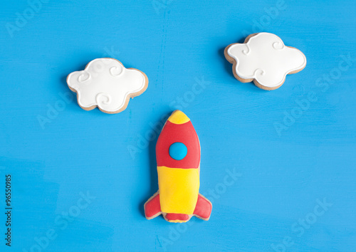 Wall mural homemade gingerbread cookies in the shape of spaceship and clouds