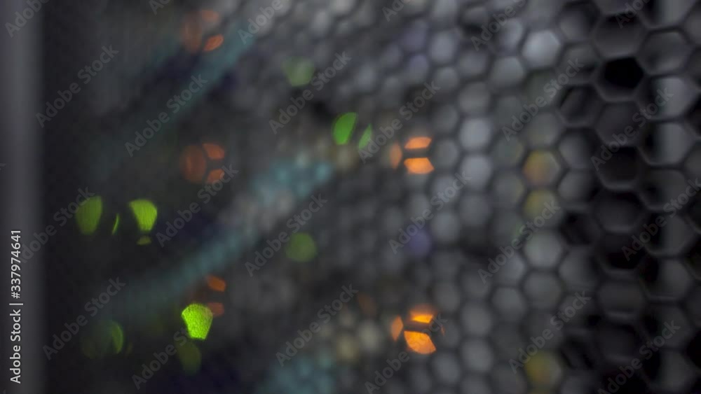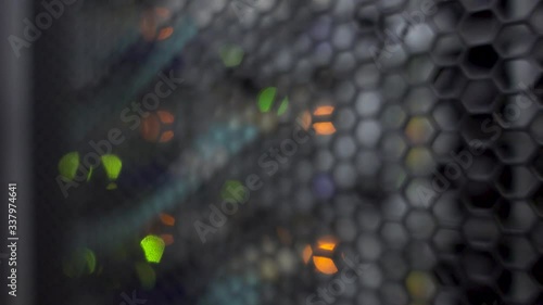 Wall mural honeycomb pattern doors inside modern big data server rack in the data center. blurred background.