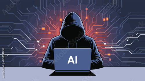 Wall mural hooded figure using ai laptop with digital circuit background symbolizing artificial intelligence in - Wall murals Wall mural hooded figure using ai laptop with digital circuit background symbolizing artificial intelligence in - Wall murals