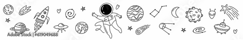 The watermark will not be included on Wall mural.: Horizontal illustration a set of space objects and symbols drawn by hand in the style of doodles