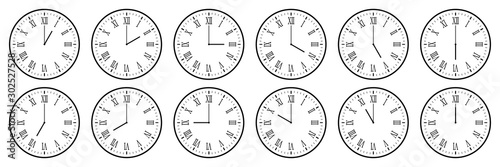 Wall mural : Horizontal set of analog clock icon with roman numeral notifying each hour isolated on white,vector