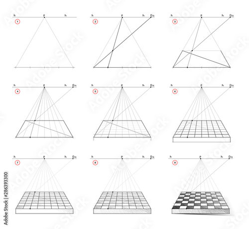 The watermark will not be included on Wall mural.: How to draw step by step chess board in perspective with vanishing point - creation step-wise pencil