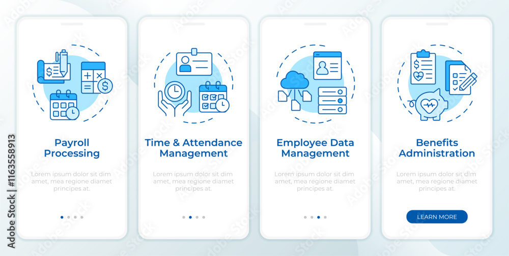 Wall mural : Hris blue onboarding mobile app screen - hr information system - walkthrough 4 steps editable graphic