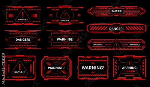 Wall mural : Hud danger and alert attention red interface signs - vector warning messages and caution text boxes o