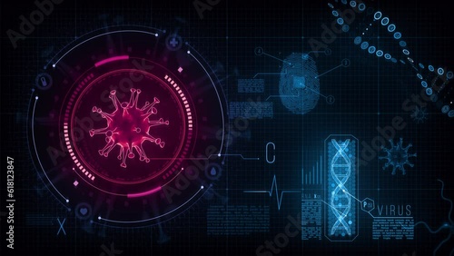 Hud interface panel with 3d virus - futuristic data screen with rotating virus model, dna, animated eWall mural