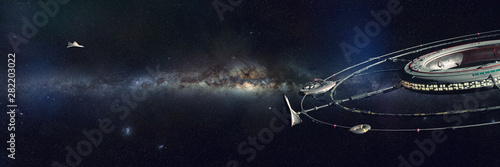Wall mural huge space station, futuristic habitat in outer space approached by a spaceship