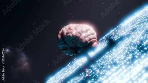 Human brain floating above glowing digital surface in dark space - artificial intelligence and neuralWall mural