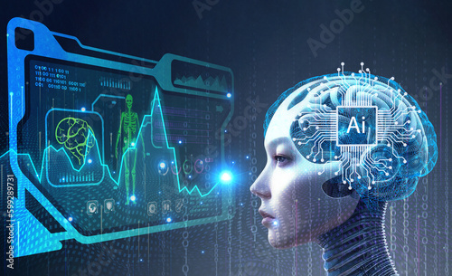 Wall mural human robots look at screens of health big data network connection background, science and artificia - Wall murals Wall mural human robots look at screens of health big data network connection background, science and artificia - Wall murals