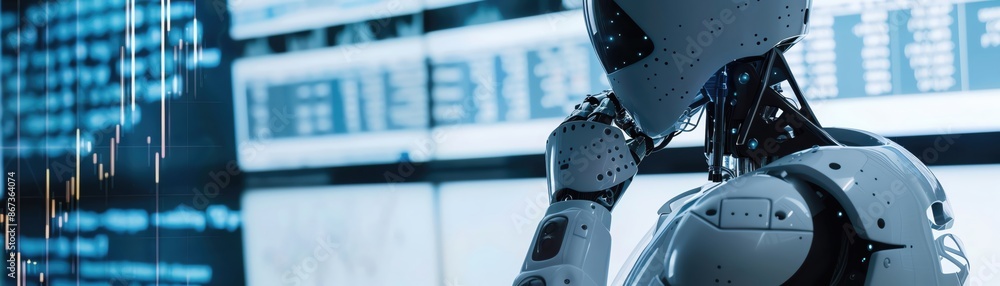 The watermark will not be included on Wall mural.: Humanoid robot with a code screen in the background -