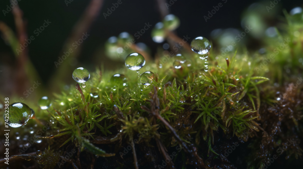 The watermark will not be included on Wall mural.: Hyper-realistic macro images featuring dewdrops on moss-covered surfaces - frame the composition to h