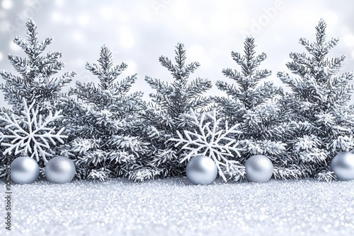 Wall mural hyper realistic photo of snowy trees with twinkling silver background and snowflakes , isolated on w