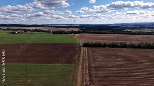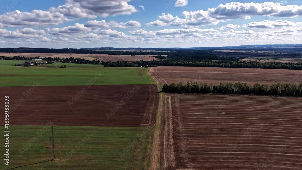 Wall mural hyperlapse of floating and dissolving clouds over a landscape of fields and meadows from a drone - Wall murals Wall mural hyperlapse of floating and dissolving clouds over a landscape of fields and meadows from a drone - Wall murals