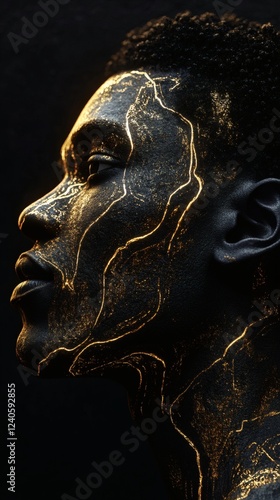 The watermark will not be included on Wall mural.: Hyperrealistic 3d image of a black man with intricate contours in gold color the contours raised in