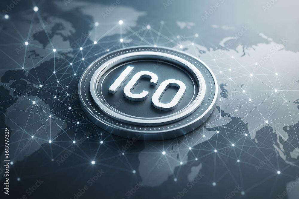 The watermark will not be included on Wall mural.: Ico digital coin on futuristic global technology network background with glowing light nodes and abs