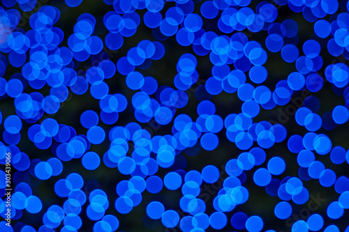 Wall mural illuminated abstract round deep blue bokeh on dark background. colourful glitter bokeh from out of f