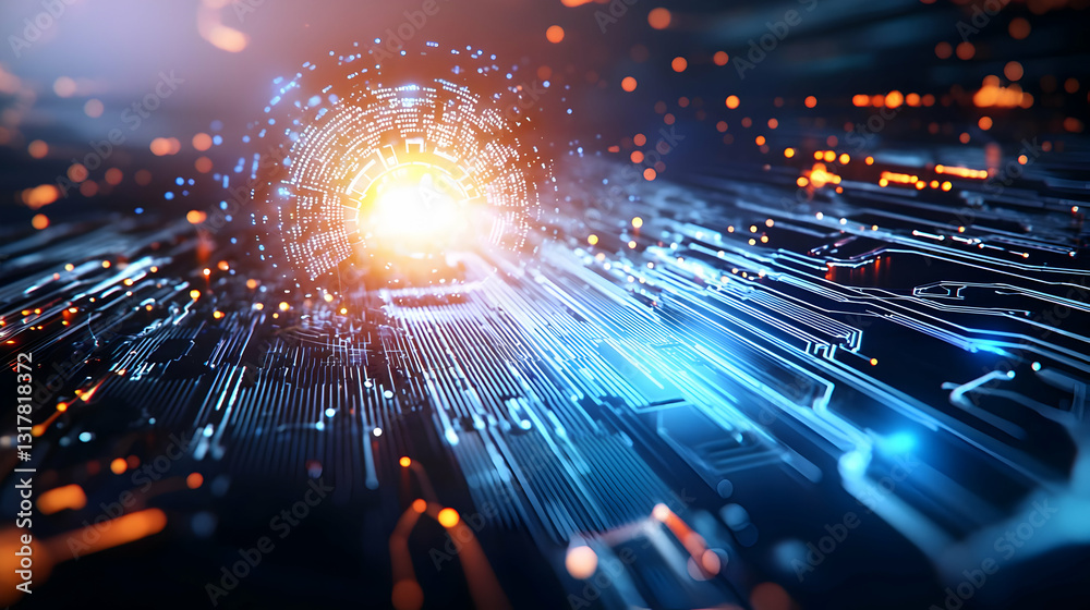 Wall mural : Illuminated blue and orange digital data stream on dark background with glowing core and particle ef