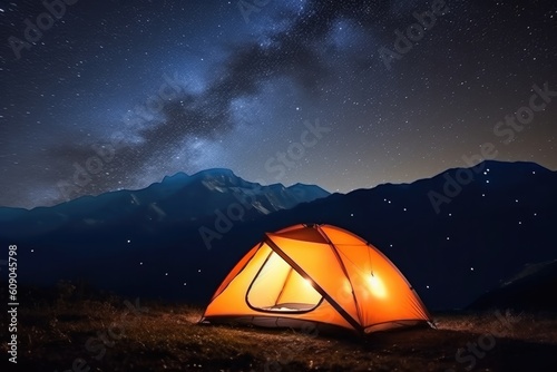 The watermark will not be included on Wall mural.: Illuminated camp tent under a view of the mountains and a starry sky - generative ai
