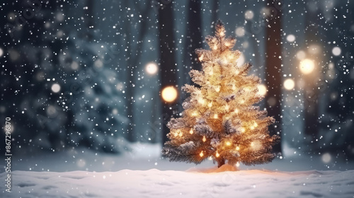 Wall mural illuminated christmas tree in the shining snow at night on shining bokeh backbround. christmas and n - Wall murals Wall mural illuminated christmas tree in the shining snow at night on shining bokeh backbround. christmas and n - Wall murals