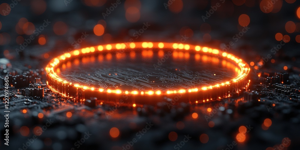 Wall mural : Illuminated circular pattern on a microchip background showcasing technology and innovation during n