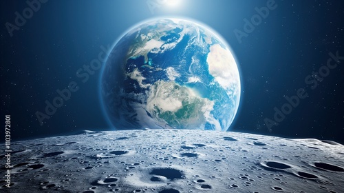Wall mural illuminated earth globe view from moon image. lunar surface with craters against planet in dark spac - Wall murals Wall mural illuminated earth globe view from moon image. lunar surface with craters against planet in dark spac - Wall murals