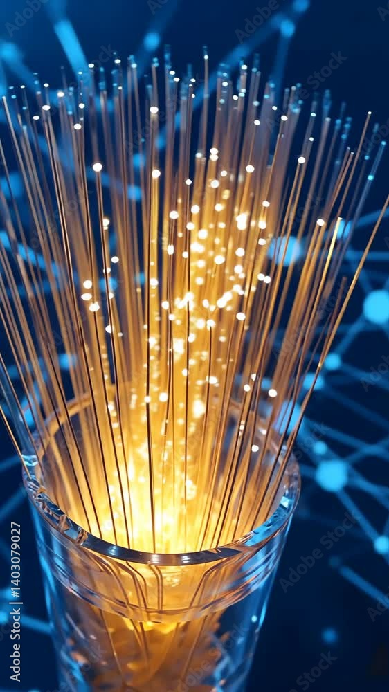 Illuminated fiber optic cables glowing inside glass, representing high speed data and networking tecWall mural