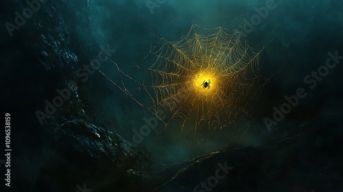 Wall mural illuminated golden spider creating a delicate web in a dark moody scene