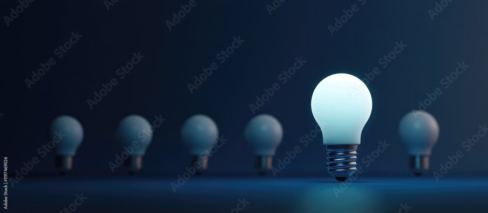 The watermark will not be included on Wall mural.: Illuminated light bulb focused in center with dim blue background and empty space for brand developm