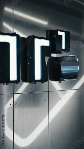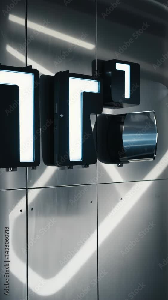 Illuminated number seven signs mounted on a shiny metal wall casting abstract geometrical light pattWall mural