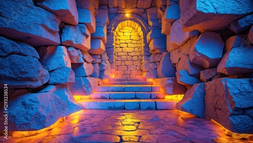 Illuminated stone archway with steps in a mystical cave lit by colorful lights and shadows creating Wall mural