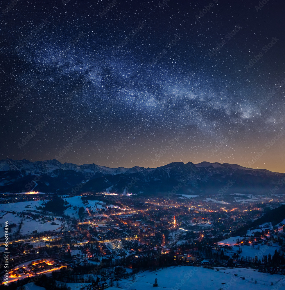 The watermark will not be included on Wall mural.: Illuminated zakopane in winter at night and milky way
